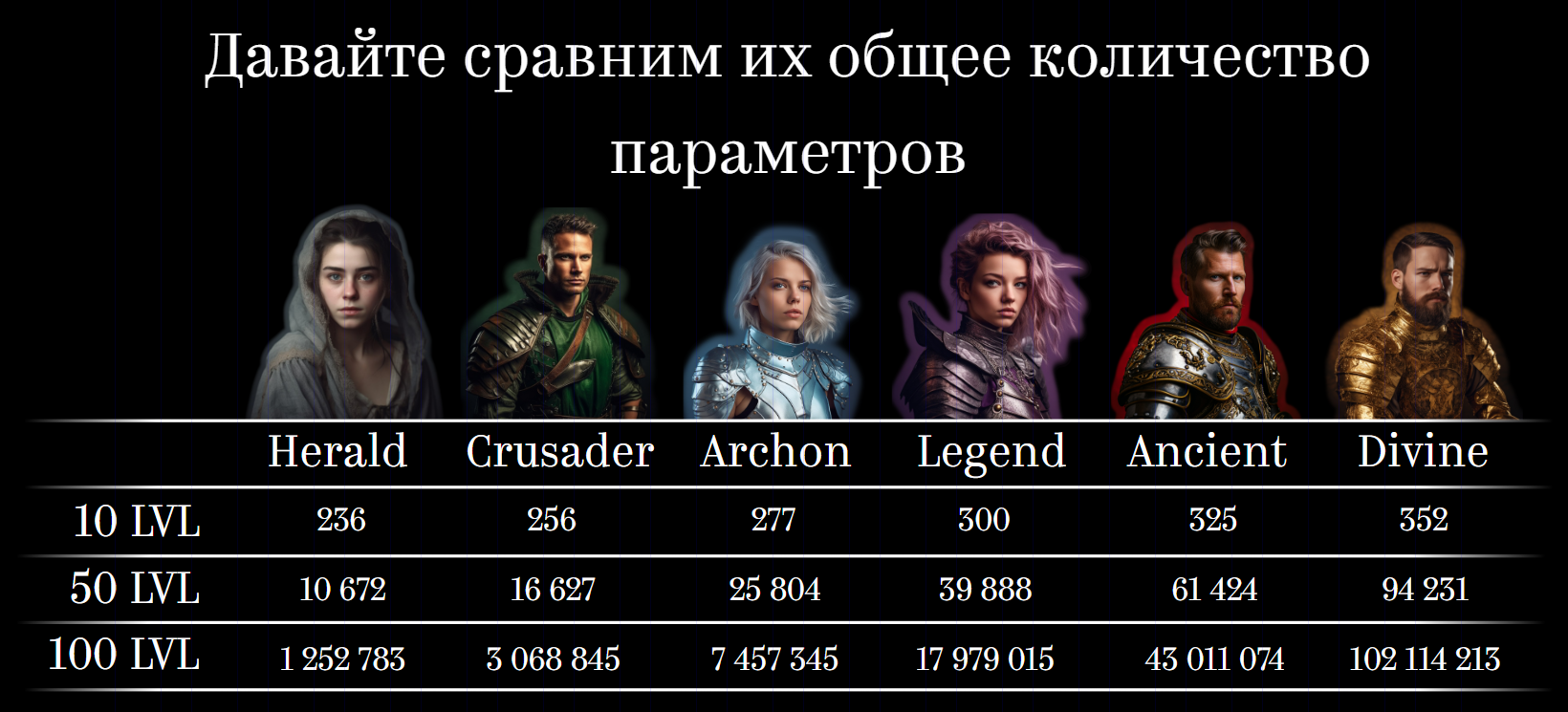 Каждый игрок может управлять героем, каждый из них уникален с точки зрения аватара и набора характеристик, затем по мере развития героя можно улучшать, например: менять ранг, уровень, увеличивать характеристики, открывать навыки и территорию владений.